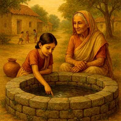 एक दोपहर, जब गाँव के अन्य बच्चे खेल रहे थे, राधिका अकेली कुएँ की जगत पर बैठी थी. उसने अपनी छोटी सी उँगली पानी में डुबोई और उस ठंडक को महसूस किया. उसने धीरे से पानी से पूछा, “तुम कहाँ जाते हो? क्या सच में तुम उस बड़ी नदी से मिलते हो जिसके बारे में दादी माँ बताती हैं?”