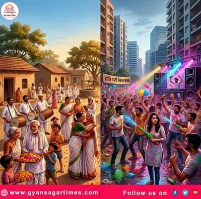 Commercialization of urban Holi – In the current market, boxes of “premium herbal colors” are sold for hundreds or thousands of rupees, with the packaging costing more than the color itself. Ironically, urban consumers overpay for “safe colors.” Furthermore, Holi parties costing thousands of rupees per person are held in five-star hotels and farmhouses. Holi in hotels and farmhouses becomes a mere theme, with dancing to Western music and the flow of alcohol being the main attractions. While the dishes used to be the pride of rural kitchens, in cities, they come packaged in Haldiram’s, Bikanerwala, or Bengali sweets.